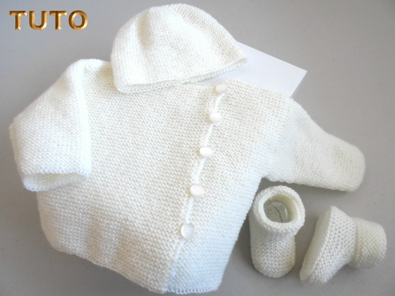 Explication du trousseau complet brassière, bonnet et chaussons, tricot laine bébé fait main – Le PDF comporte des illustrations photos et les explications de tous les points utilisés, en FRANCAIS