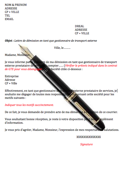 GESTIONNAIRE DE TRANSPORT EXTERNE LETTRE DE DÉMISSION POUR LA DRIEA - DREAL - DEAL