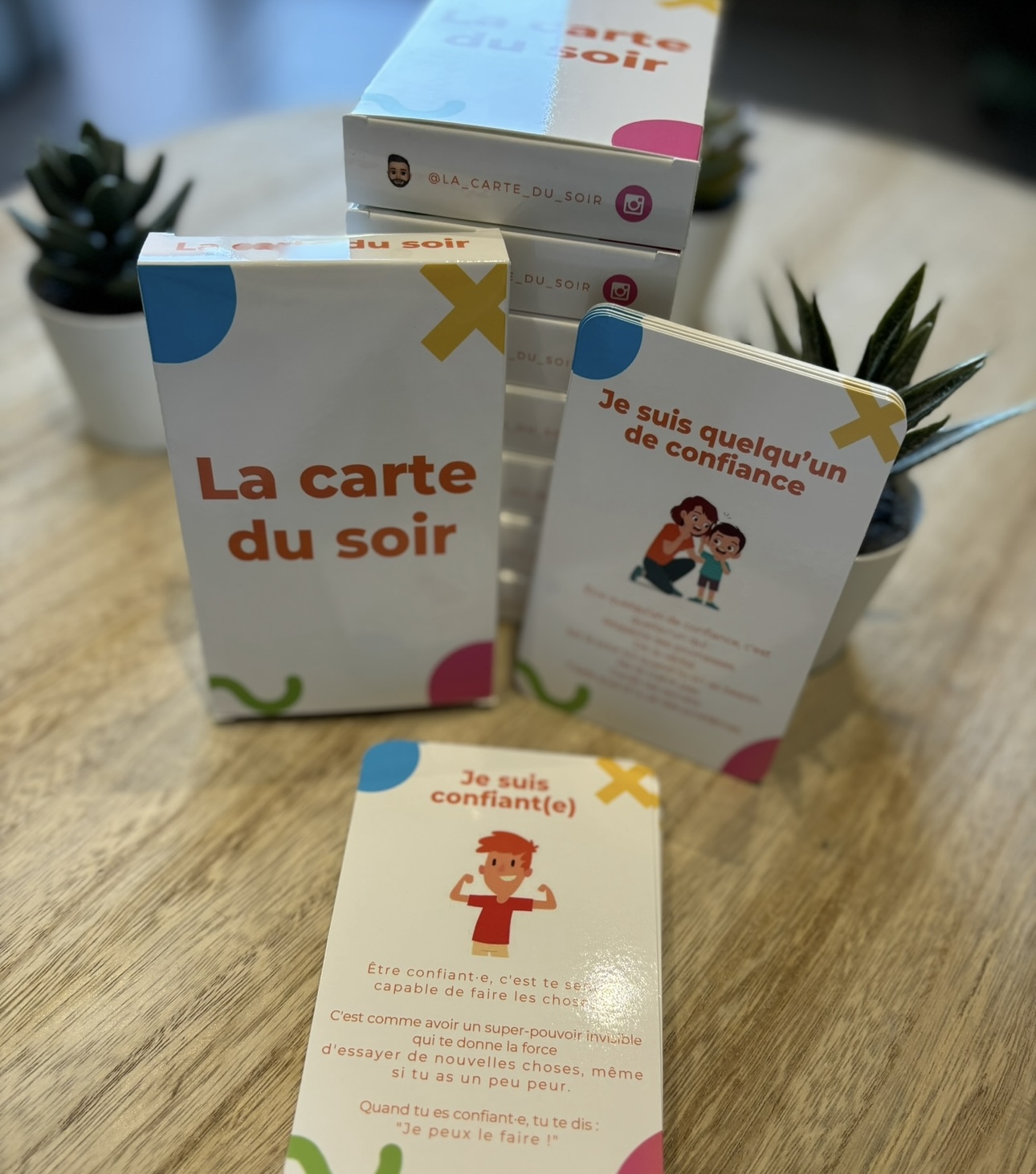 "La carte du soir" est un ensemble de 46 cartes éducatives que j'ai créé pour accompagner les enfants dans leur découverte des valeurs essentielles. Chaque carte propose une thématique différente : la confiance, l’entraide, la patience, le courage...